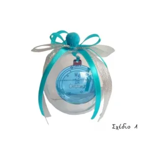 Χριστουγεννιάτικη κρεμαστή γαλάζια μπαλίτσα “Τα Πρώτα μου Χριστούγεννα” στολισμένη με κορδέλες