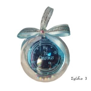 Χειροποίητη χριστουγεννιάτικη διαφανής μπάλα με γαλάζιο plexi στολίδι που γράφει “My 1st Christmas”.