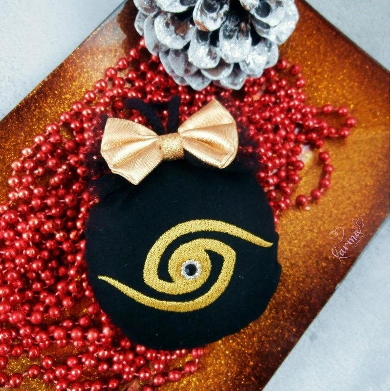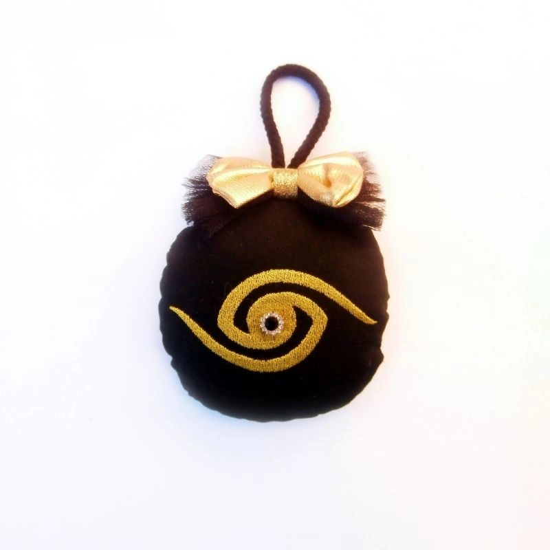 Χριστουγεννιάτικο υφασμάτινο στολίδι μπάλα με κεντημένο σχέδιο μάτι και χρυσό φιόγκο.