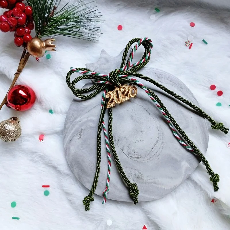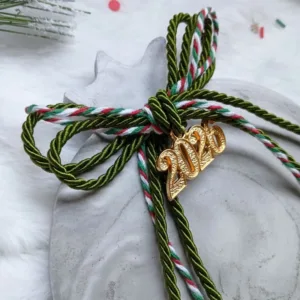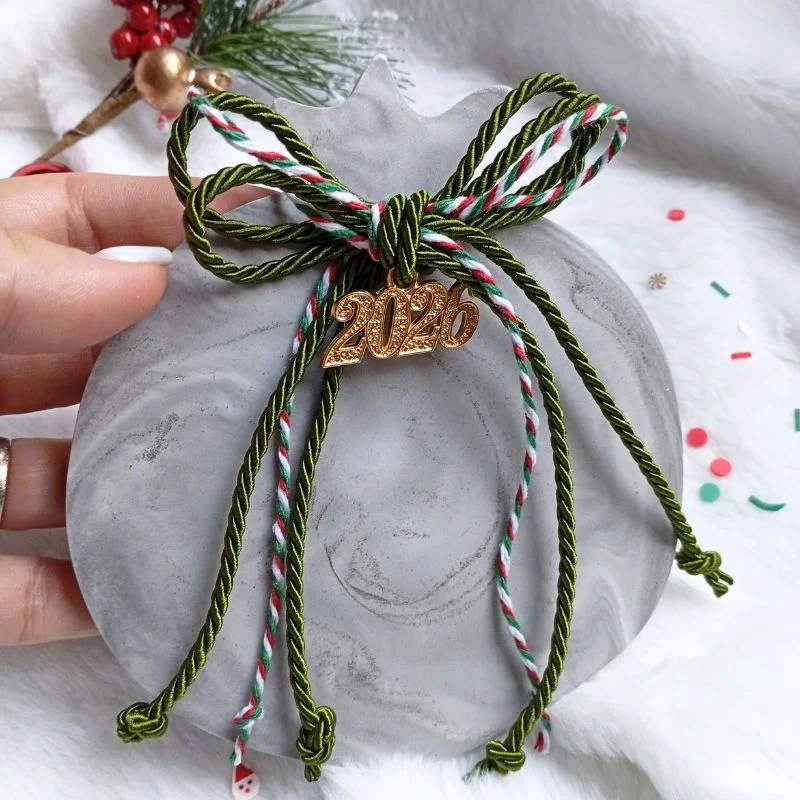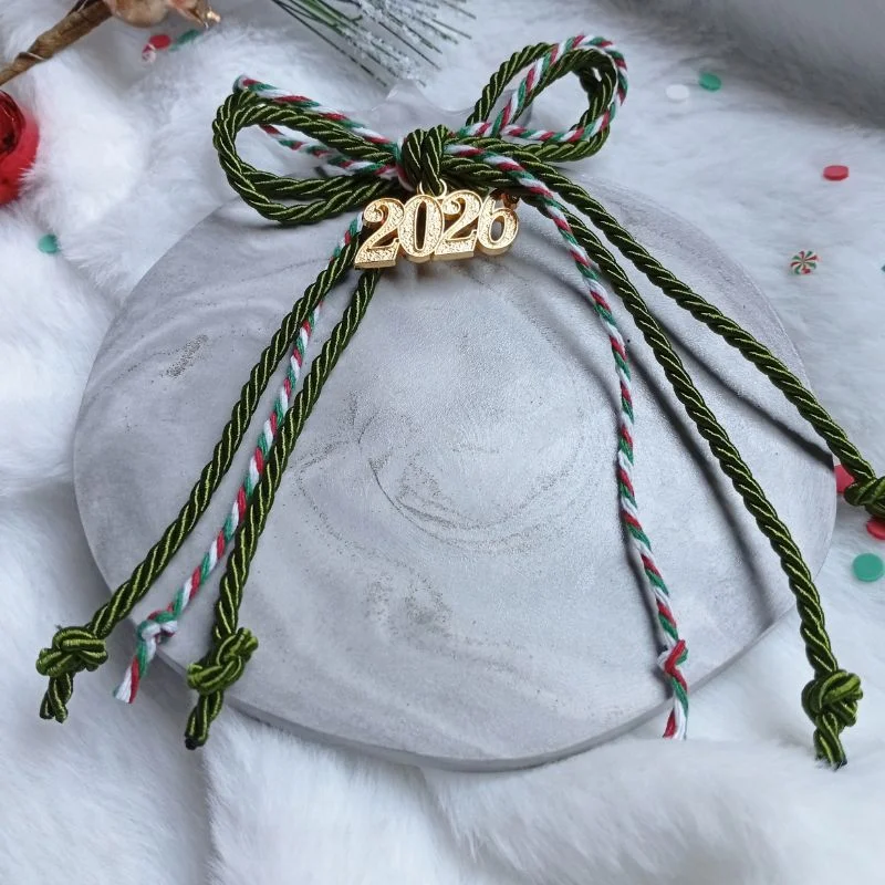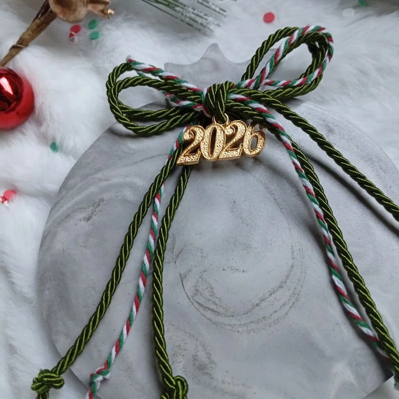 Χειροποίητο, με πράσινο κορδόνι τρίκλωνο και μεταλλικό κρεμαστό στοιχείο “2026”.