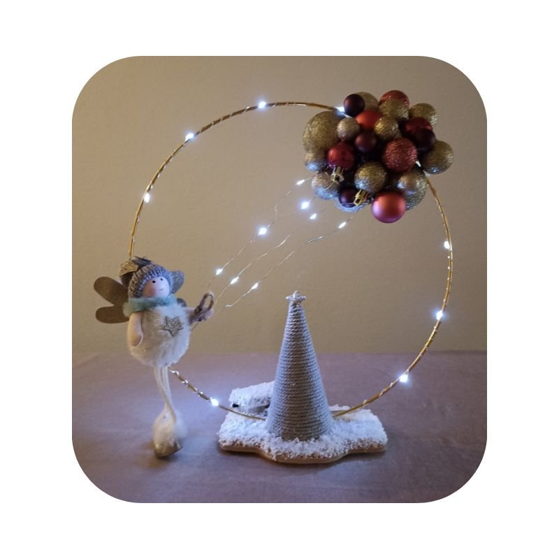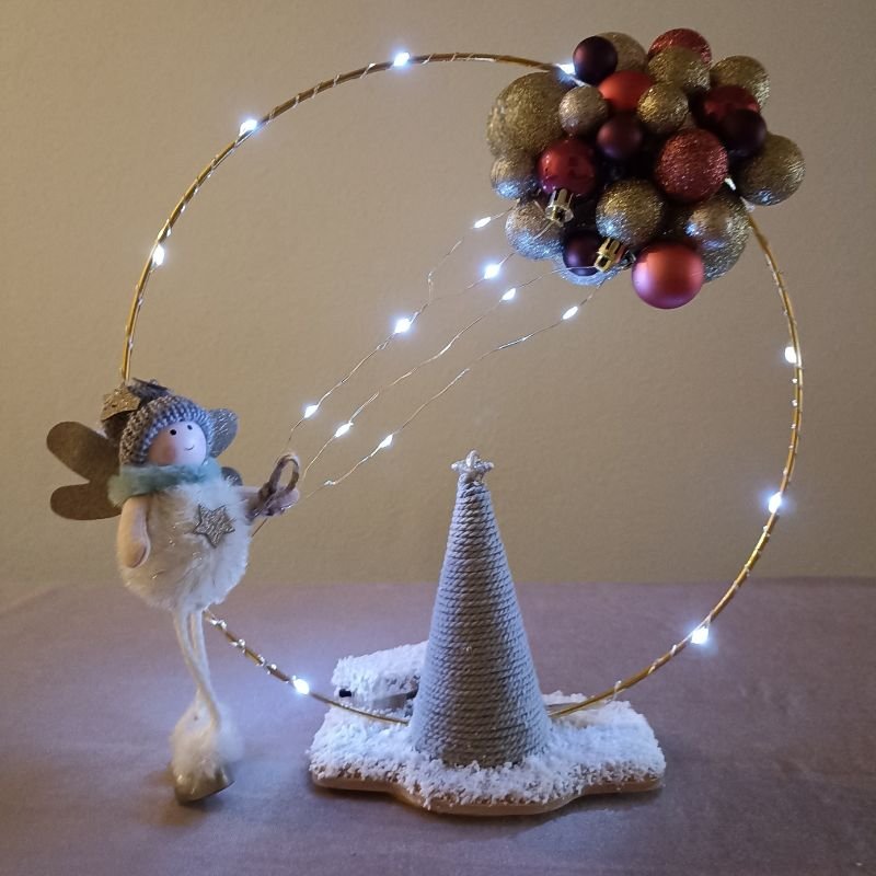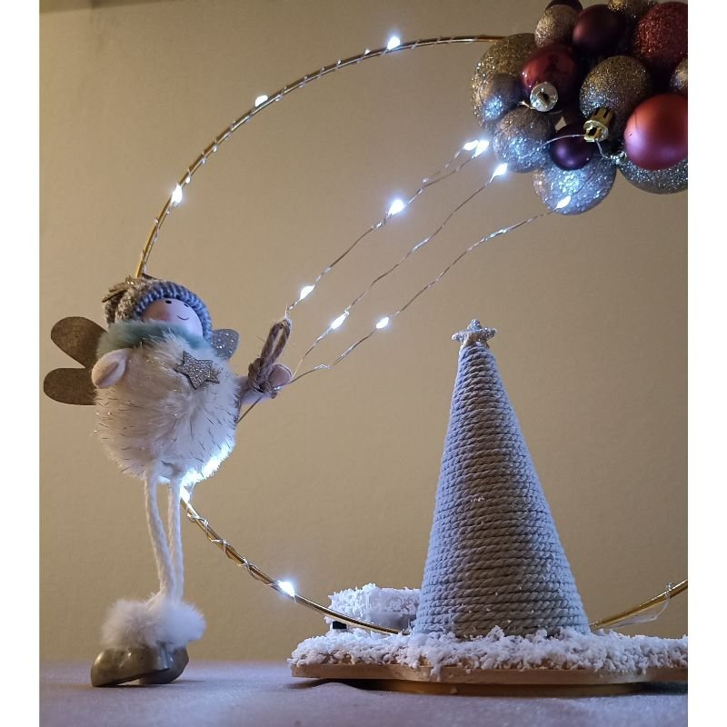 Το χειροποίητο επιτραπέζιο στεφάνι LED με αγγελάκι δημιουργείται αποκλειστικά για εσένα και φέρνει γιορτινή ατμόσφαιρα σε κάθε χώρο. Με διάμετρο 30 εκατοστά, είναι ιδανικό για τραπέζι, ράφι ή οποιοδήποτε σημείο θέλεις να στολίσεις με γιορτινή ατμόσφαιρα.