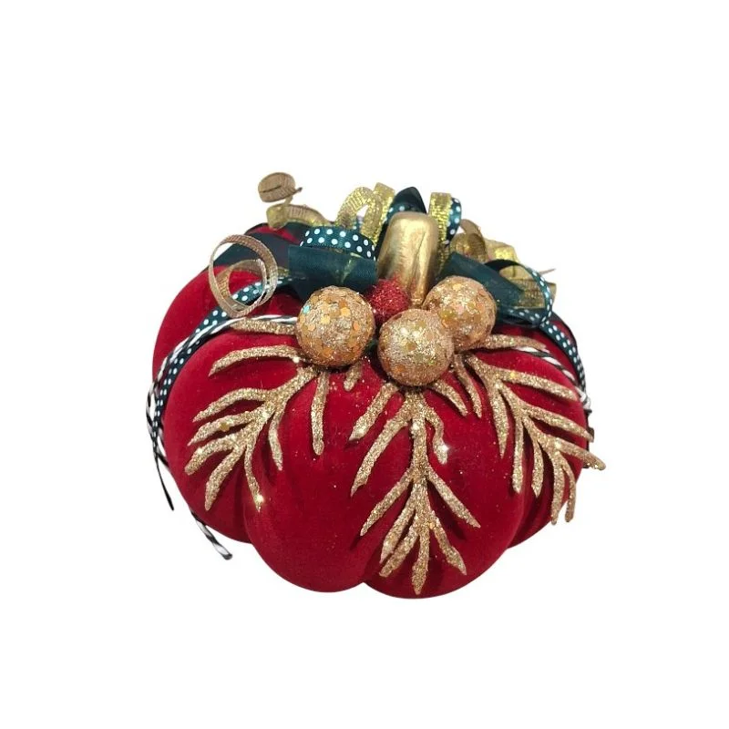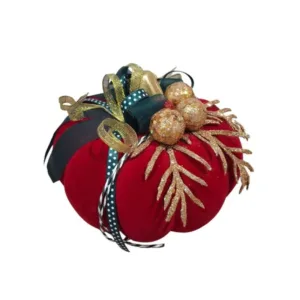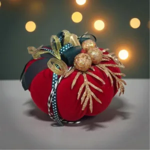 Ένα γούρι, μια κεραμική βελουτέ κόκκινη κολοκύθα με χριστουγεννιάτικο στολισμό.