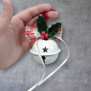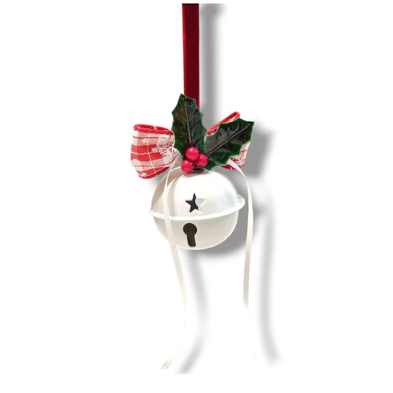 Κρεμαστό διακοσμητικό λευκό κουδουνάκι με κόκκινες και άσπρες κορδέλες. Οικονομικό δωράκι που θα ενθουσιάσει τον παραλήπτη με το κουδούνισμά του και θα βρει μια θέση στο χριστουγεννιάτικο δέντρο του.