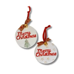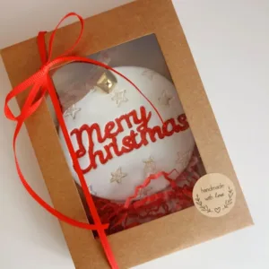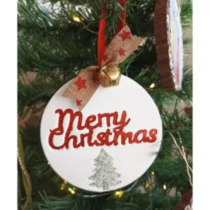 Αναγράφει “Merry Christmas” και και ολοκληρώνεται με βελούδινη κόκκινη κορδέλα και ένα μικρό κουδουνάκι, έτοιμο για κρέμασμα.