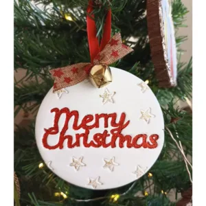 Χειροποίητο χριστουγεννιάτικο στολίδι από πηλό, διαμέτρου περίπου 9 εκ., φτιαγμένο εξολοκλήρου στο χέρι χωρίς καλούπι. Το σχέδιο έχει δημιουργηθεί με τεχνική βαθυτυπίας, ενώ η επιφάνεια είναι ζωγραφισμένη με λευκό ακρυλικό χρώμα και διακοσμημένη με έξτρα γκλίτερ για να προσδίδει τη μαγεία των Χριστουγέννων.