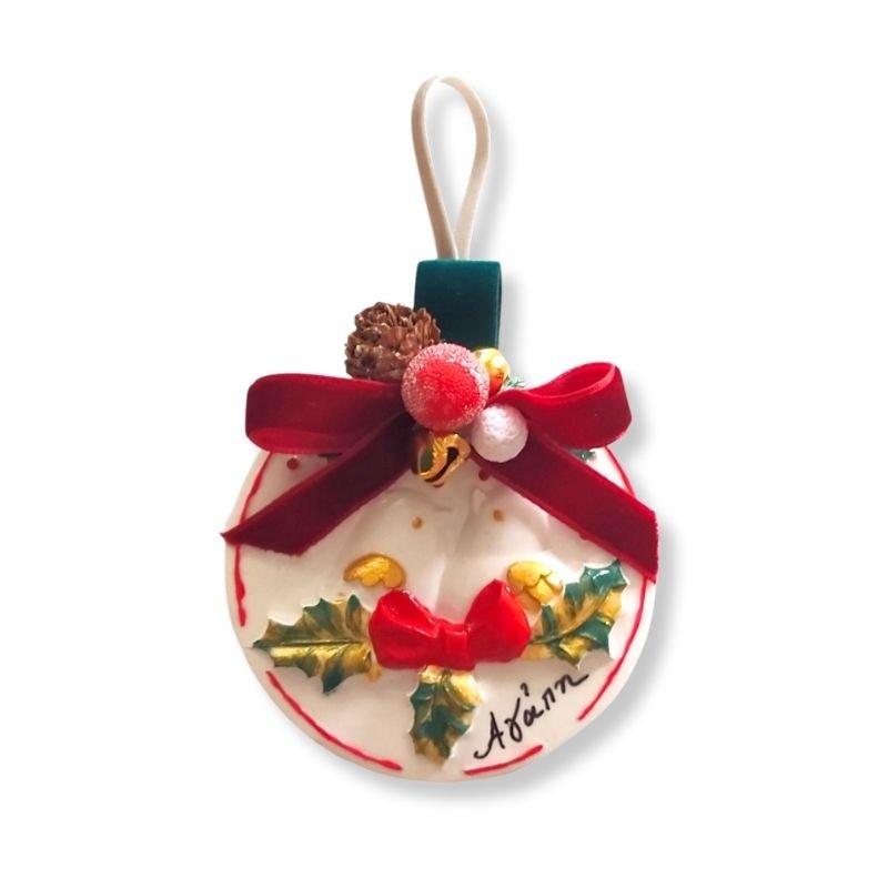 Χειροποίητο πορσελάνινο γούρι σε σχήμα κουδουνιού, διακοσμημένο με γιορτινές λεπτομέρειες, φιόγκο και φυσικά στοιχεία.