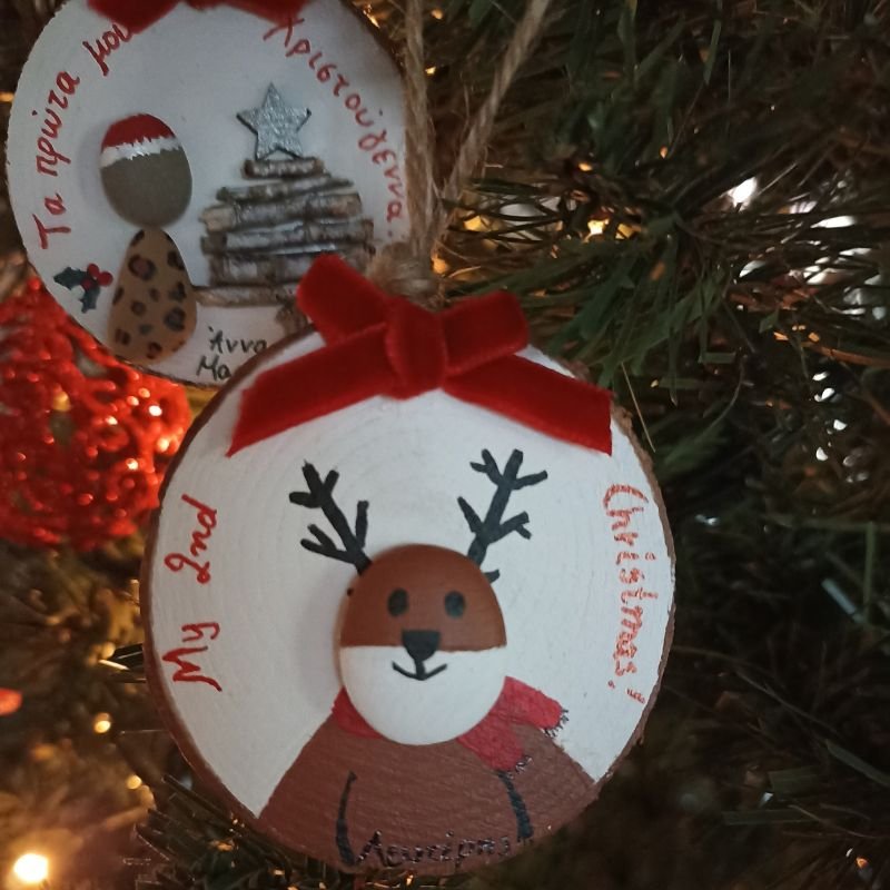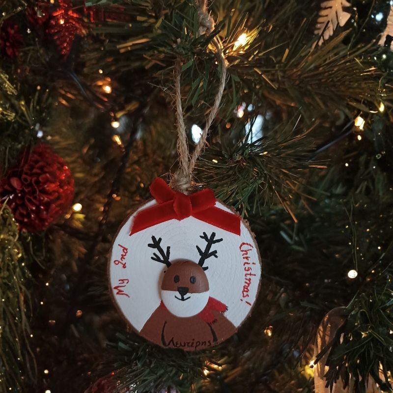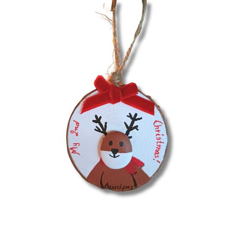 Μικρό, γλυκό και μοναδικό στολίδι-ταρανδάκι (~6-7 εκ.), ζωγραφισμένο στο χέρι σε φυσικό κορμό ξύλου. Ιδανικό για να γράψετε το όνομα του παιδιού, τη χρονιά ή μια τρυφερή φράση όπως «Τα πρώτα μου Χριστούγεννα».
