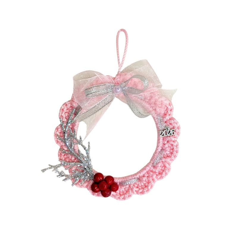 Πλεκτό ροζ στεφανάκι, στολισμένο ασημί κορδέλες, γκι και μεταλλικό 2026.