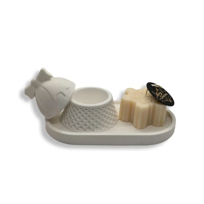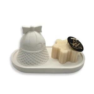 Χριστουγεννιάτικο σετ δώρου – 3 τεμάχια – 1 Κεραμικό λευκό δισκάκι,  1 κεραμική διακοσμητική λευκή καμπανούλα & 1 λευκή Χιονονιφάδα από 100% Φυτικό κερί ελαιοκράμβης και βαμβακερό φυτίλι.