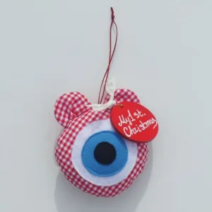 Χειροποίητο χριστουγεννιάτικο στολίδι για τα πρώτα Χριστούγεννα του μωρού. Κρεμαστό υφασμάτινο ματάκι – αρκουδάκι και ξύλινη ταμπελίτσα”My 1st Christmas”.