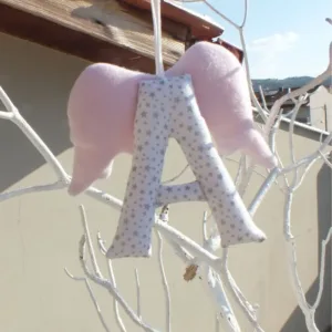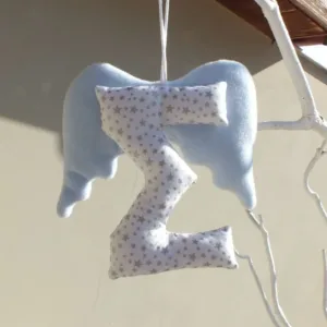 Προσωποποιημένο Χριστουγεννιάτικο στολίδι μονόγραμμα με φτερά αγγέλου. Το υφασμάτινο μονόγραμμα είναι χειροποίητο από βαμβακερά υφάσματα και τα φτερά από φλίς.