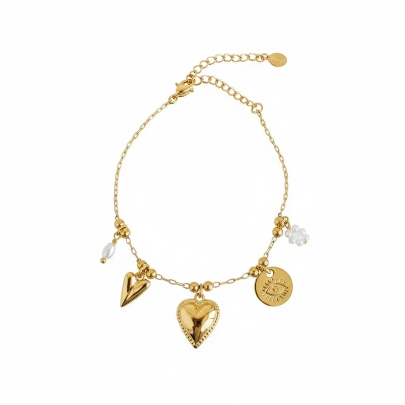 Χρυσό βραχιόλι από Ανοξείδωτο Ατσάλι με εντυπωσιακά charms σε σχήμα καρδιάς με ανάγλυφες λεπτομέρειες & ένα διακριτικό “ματάκι” για τύχη και προστασία.