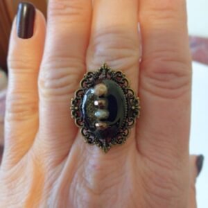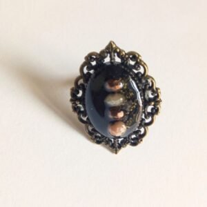 Δαχτυλίδι χειροποίητο, σε στυλ vintage, διακοσμημένο με κρύσταλλα. Εσωτερικά έχει ζακάρ ύφασμα σε μαύρο-σκούρο πράσινο-μπρονζέ και είναι επικαλυμμένο με υγρό γυαλί, σε μπρονζέ αντικέ πλαίσιο.