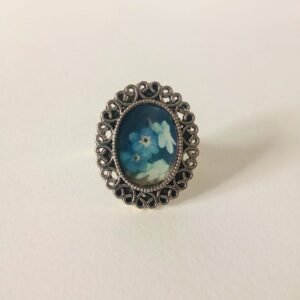 Δαχτυλίδι αυξομειούμενο, σε στυλ vintage, σε μπλε αποχρώσεις, με απεικόνιση λουλουδιών, με επικάλυψη υγρού γυαλιού, σε ασημί αντικέ οβάλ μεταλλικό πλαίσιο.
