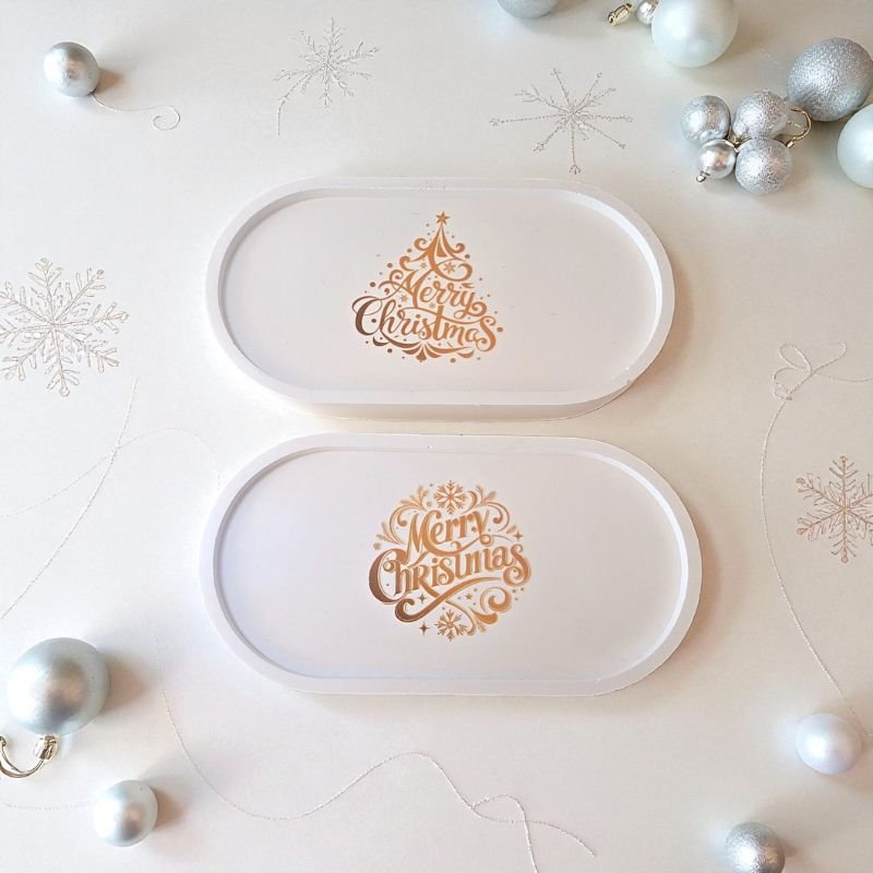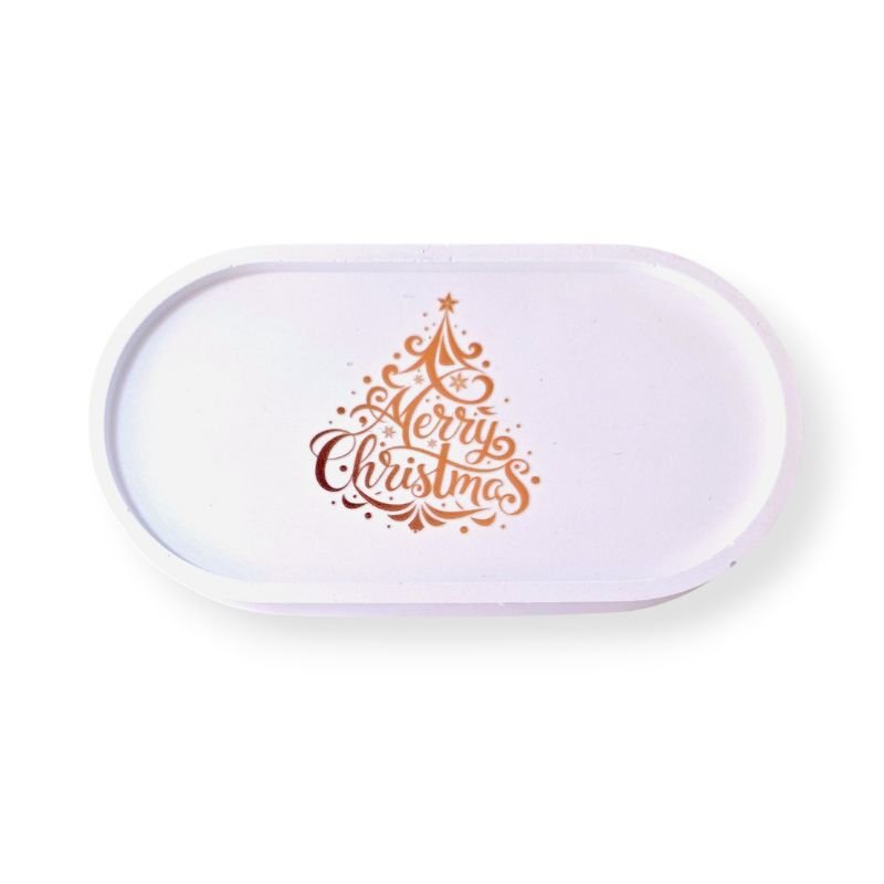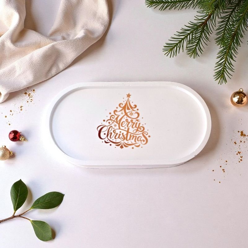 Ένας κομψός και λιτός οβάλ διακοσμητικός δίσκος από πορσελάνη, διακοσμημένος με χρυσοτυπία Merry Christmas.