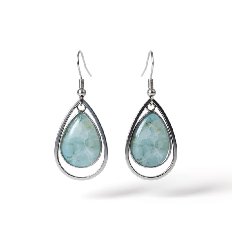 Διπλά κρεμαστά σκουλαρίκια από ατσάλινη ασημένια βάση , σε σχήμα δάκρυ και σχέδιο που θυμίζουν πέτρα.