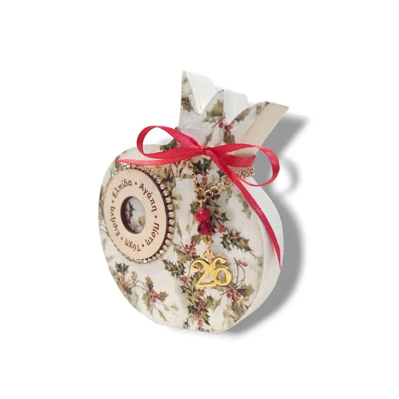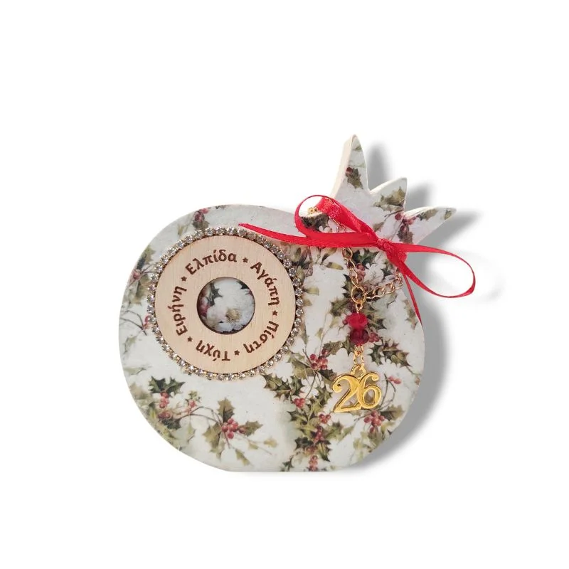 Επιτραπέζιο αυτοστηριζόμενο γούρι με ευχές για μια καλή χρονιά, γραμμένες πάνω σε ξύλινο δίσκο, στολισμένο περιμετρικά με στρασάκια.