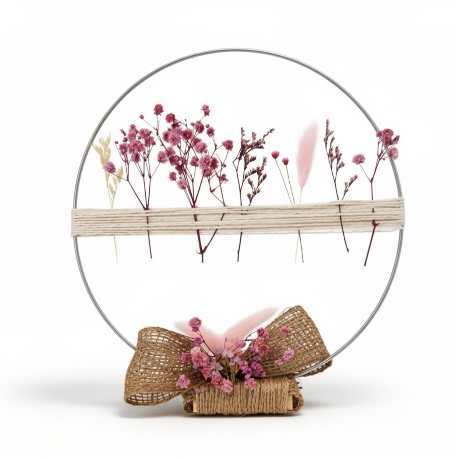 Μεταλλικό επιτραπέζιο στεφανάκι με βάση τυλιγμένη από σπάγκο και ροζ λουλουδάκια. Στη μέση του είναι δεμένος μπεζ σπάγκος με όρθια δεμένα διάφορα φυσικά αποξηραμένα λουλούδια σε διάφορες αποχρώσεις του ροζ – μωβ.