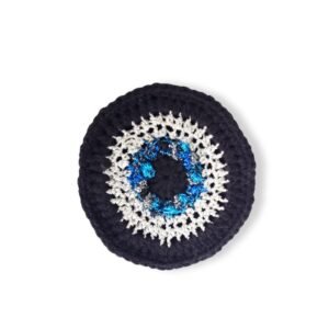 Πλεκτό φυλαχτό ματάκι με ασημί ή λούρεκς κλοστή, χριστουγεννιάτικο γούρι: νήματα 100% micro poliester και 55% Cotton – 45% Acrylic, υποαλλεργικά.