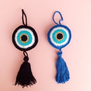 Πλεκτό φυλαχτό ματάκι με χρυσή κλωστή, χριστουγεννιάτικο γούρι: νήματα 100% micro poliester και 55% Cotton – 45% Acrylic, υποαλλεργικά.