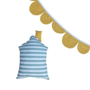 Υφασμάτινη γιρλάντα που αποτελείται από 9 οβάλ σημαιάκια σε τρία μεγέθη με συνολικό μήκος 1,80 m. ραμμένη με 100% βαμβακερά υφάσματα.Το μεγαλύτερο σημαιάκι είναι περίπου 12 x 13 cm. Η γιρλάντα μπορεί να διακοσμήσει τα κάγκελα της βρεφικής κούνιας, το παιδικό δωμάτιο, το πάρτι η την βάπτιση. Πλένεται στους 30 βαθμούς.Μπορεί να συνδυαστεί με διακοσμητικό μαξιλάρι από 100% βαμβακερό ύφασμα και γέμισμα απο υποαλλεργική πολυεστερική ίνα με διαστάσεις περίπου 35 επί 22 εκατοστά.