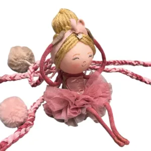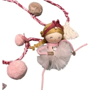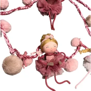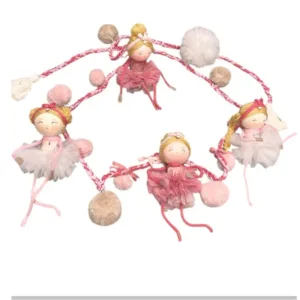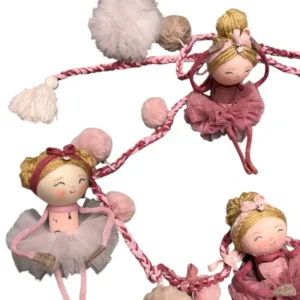 Αυτή η υπέροχη γιρλάντα φιλοξενεί 4 κομψές μπαλαρίνες που είναι έτοιμες για τη δική τους παράσταση! Οι μπαλαρίνες έχουν τα ποδαράκια τους σε έκταση, με μαλλιά από μαλακό μοχέρ και κάθε μία με διαφορετικό μπαλετικό χτένισμα. Δύο έχουν εκρού πρόσωπο και δύο ροζ πουδρέ, ενώ όλες φορούν τούλινες φούστες μπαλέτου και λεπτές κορδέλες με φιόγκους και μικροσκοπικά λουλουδάκια στο κεφάλι.