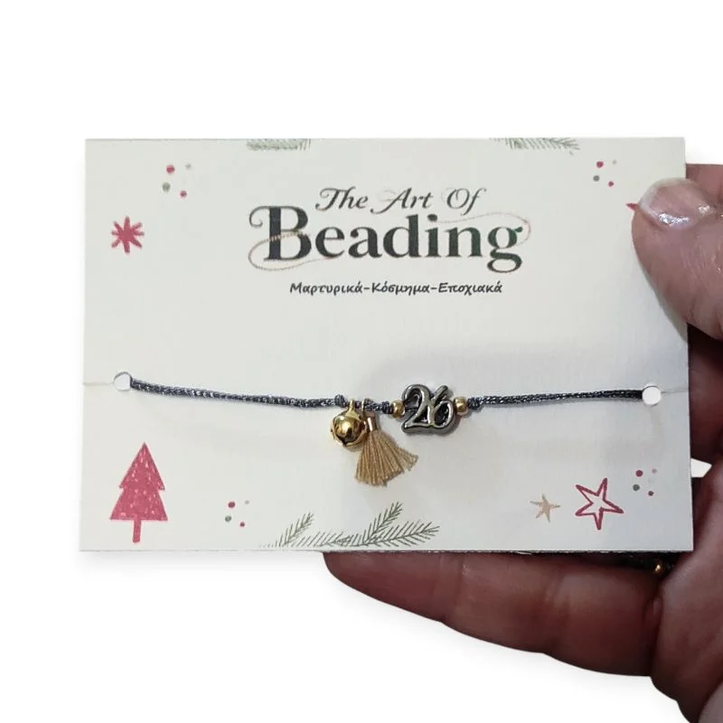 Βραχιόλι γούρι με περαστό μεταλλικό στοιχείο 26, κουδουνάκι και μπεζ φουντίτσα, περασμένα σε μεταλλιζέ ασημί κορδόνι.