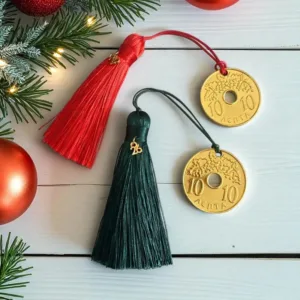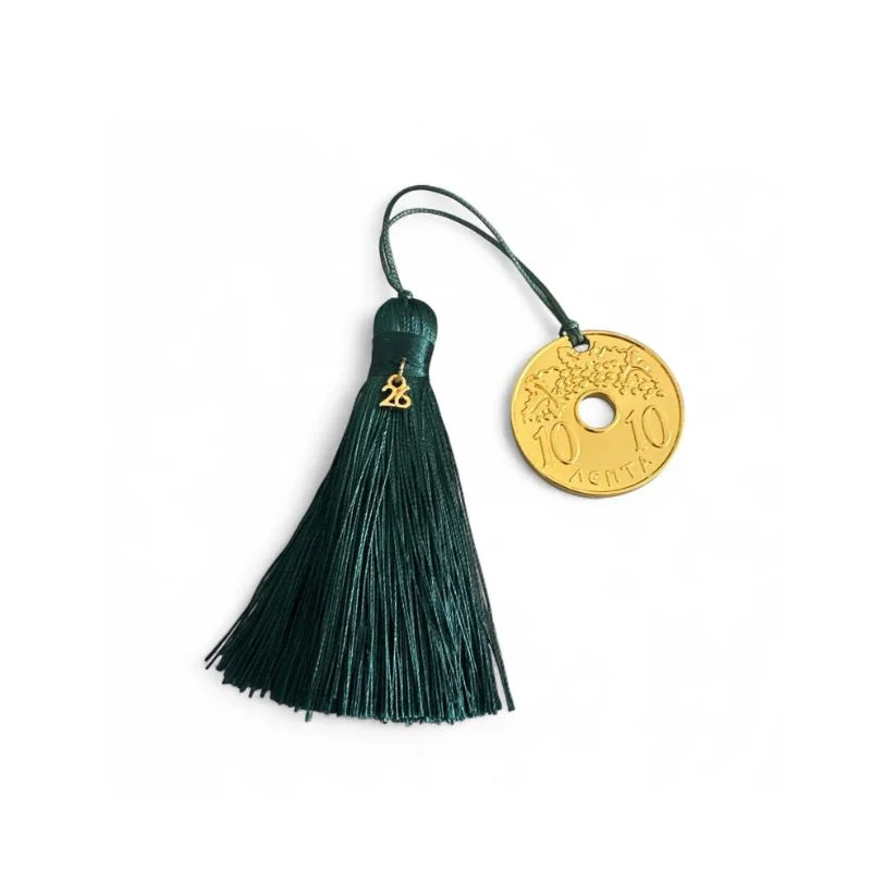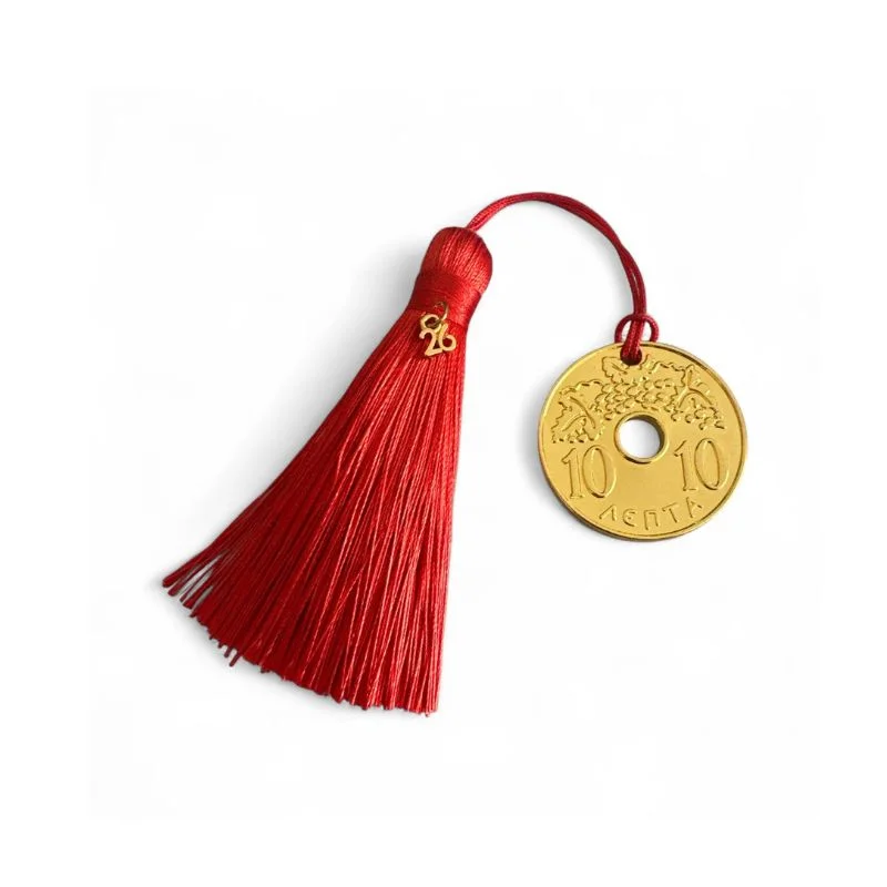 Ένα παραδοσιακό γούρι για καλή τύχη και οικονομική ευημερία. Η δεκάρα έχει διάμετρο 3,8εκ και η φούντα είναι διαθέσιμη σε δύο χρώματα, κόκκινη και πράσινη.
