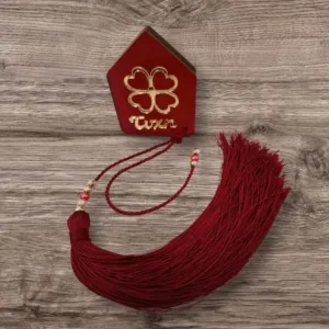 Επιτραπέζιο Χριστουγεννιάτικο διακοσμητικό Σπιτάκι από πλέξιγκαλ, με σχέδιο τετράφυλλο τριφύλλι και μακριά εντυπωσιακή φούντα.