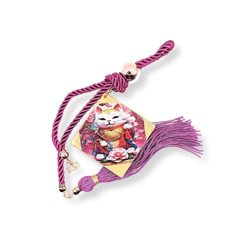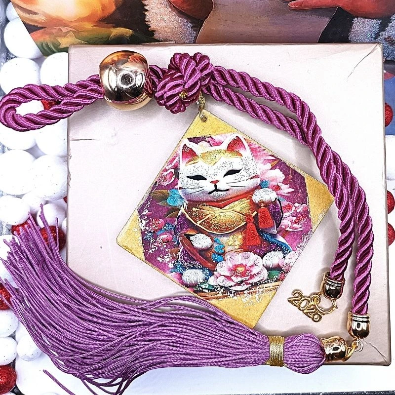 Γούρι με ξύλινο πλακίδιο τετράγωνο με Μανέκι Νέκο (την κινέζικη γάτα που φέρνει τύχη) σε λαμπερά φωτεινά χρώματα, glitter και υγρό γυαλί. Κορδόνια και φούντα μεγάλη σε μοβ/λιλά χρώμα και μεταλλικές λεπτομέρειες σε χρυσό χρώμα. Αποστέλλεται σε συσκευασία δώρου.
