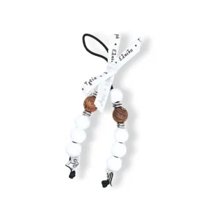 Γουράκι μπεγλεράκι με χάντρες ξύλινες σε λευκό και καφέ χρώμα, και μεταλλικά στοιχεία σε ασημί. Χάντρα με χαραγμένο “26” από τη μία μεριά και φτερό αγγέλου από την άλλη. Δύο παραλλαγές: 8 χάντρες λευκές και 2 καφέ, 8 χάντρες καφέ και 2 λευκές. Αποστέλλεται με όμορφο αμπαλάζ.