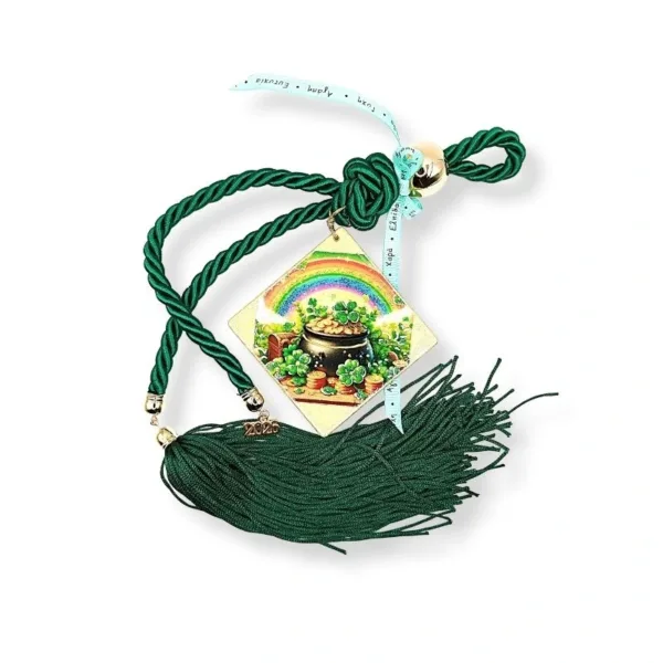 Γούρι με ξύλινο πλακίδιο τετράγωνο με Ουράνιο Τόξο, νομίσματα χρυσά και τριφυλλάκια σε χρώματα φωτεινά λαμπερά glitter και υγρό γυαλί. Κορδόνια και φούντα μεγάλη σε κυπαρισσί χρώμα και μεταλλικές λεπτομέρειες σε χρυσό χρώμα. Αποστέλλεται σε συσκευασία δώρου.
