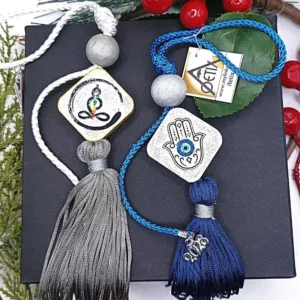 Χάντρα ξύλινη σε και μεταλλικό “26” σε χρυσό χρώμα. Κορδόνι πλεκτό γυαλιστερό καφέ και φούντα μεγάλη σε χρυσό χρώμα. Συνολικό ύψος 25 εκατοστά.