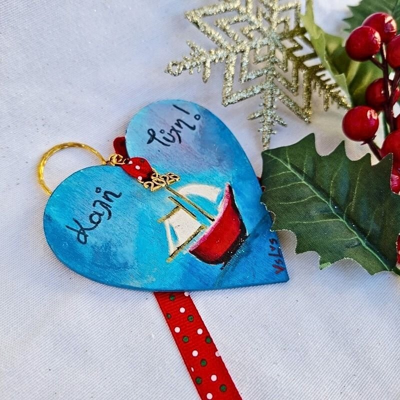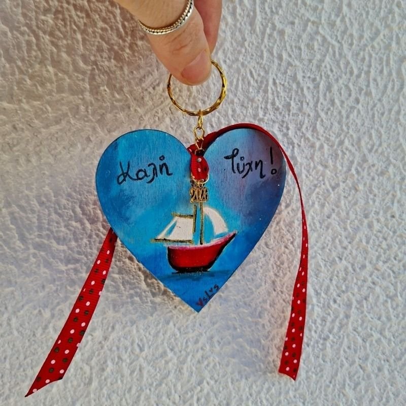 Ξύλινο γούρι σε σχήμα καρδιάς, ζωγραφισμένο στο χέρι με ακρυλικά χρώματα.