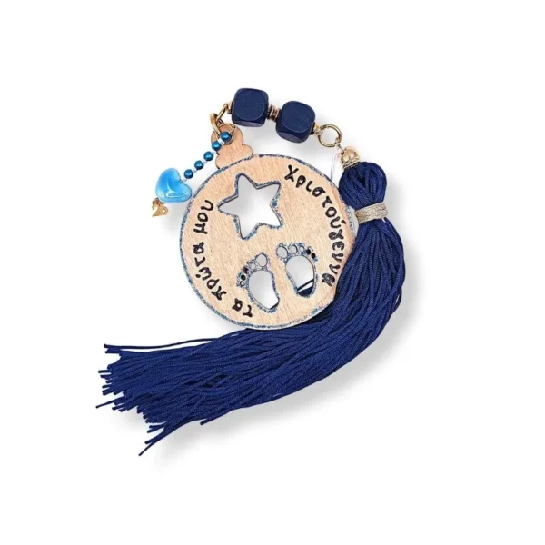 Γούρι για νεογέννητα με ξύλινο στοιχείο με πατουσάκια και αστεράκι, μπλε φούντα και κρεμαστή κεραμική καρδούλα γαλάζια. Κάθε γούρι της σειράς είναι μοναδικό γιατί είναι χειροποίητο. Custom γούρι για τη Νέα Χρονιά. Αποστέλλεται σε συσκευασία δώρου.