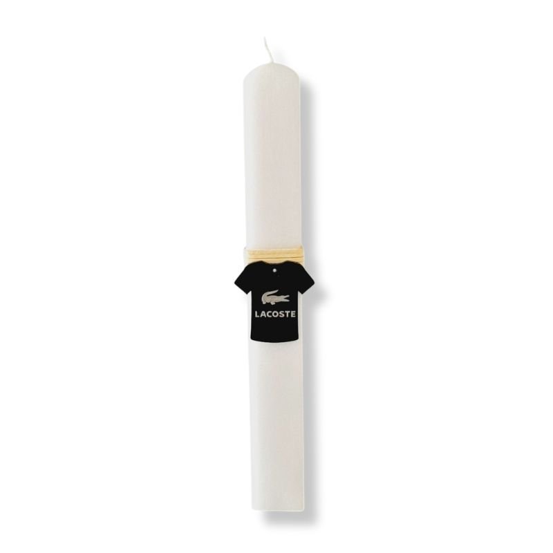 Η λευκή λαμπάδα είναι διακοσμημένη με κορδόνι και μια μικρή ξύλινη μπρελόκ-μπλούζα, δίνοντας μια μοναδική και μοντέρνα αισθητική.
