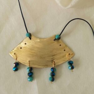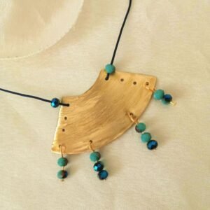 Κολιέ από ορείχαλκο, διαμορφωμένο εξ ολοκλήρου στο χέρι σε χρυσαφί χρώμα και κρύσταλλα δίχρωμα σε μπλε-γαλάζιο.