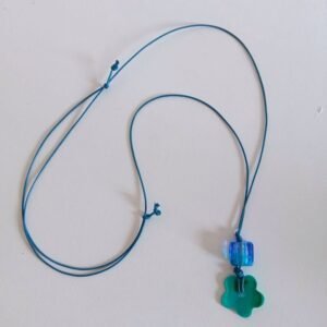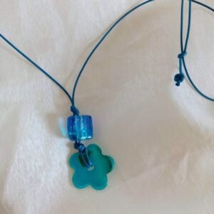 Κoλιέ από όστρακο σε γαλάζιο-πετρόλ και εντυπωσιακή πέτρα από γυαλί, σε αποχρώσεις του μπλε και γαλάζιου, με πετρόλ κορδόνι, μακρύ, αυξομειούμενο. Πολύ ελαφρύ. Μπορεί να φορεθεί όλες τις ώρες.