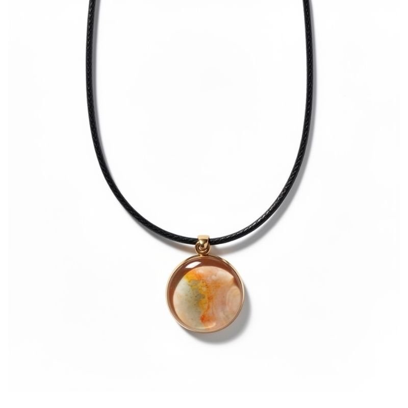 Κολιέ με μενταγιόν από υγρό γυαλί σε μεταλλική χρυσή βάση και φωτεινά – ζωηρά χρώματα! Υπερισχύει το ροζ , πορτοκαλί και κίτρινο. Συνδυάζεται με μαύρο λουράκι που αυξομειώνει.