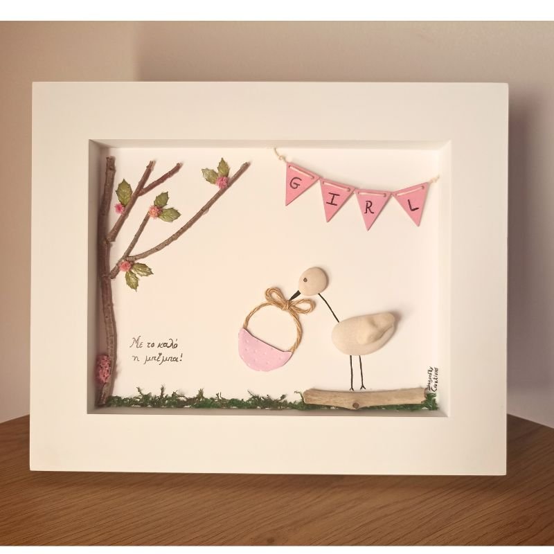 Χειροποίητο καδράκι Pebble Art με πελαργό, ιδανικό για να γιορτάσετε με τρυφερότητα την αναμονή του μωρού και να προσφέρετε ένα ξεχωριστό δώρο στη μέλλουσα μαμά.