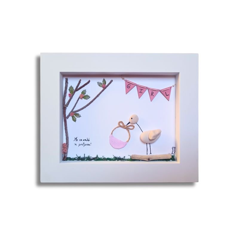 Το καδράκι απεικονίζει έναν πελαργό, φτιαγμένο με υλικά από τη φύση και είναι διακοσμημένο με γλυκά στοιχεία σε ροζ ή μπλε αποχρώσεις, ώστε να αναδειχθεί το φύλο του μωρού με διακριτικό και συμβολικό τρόπο.
