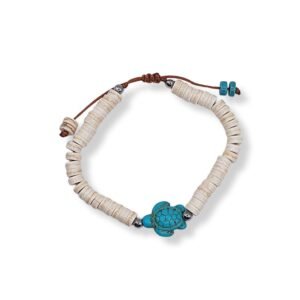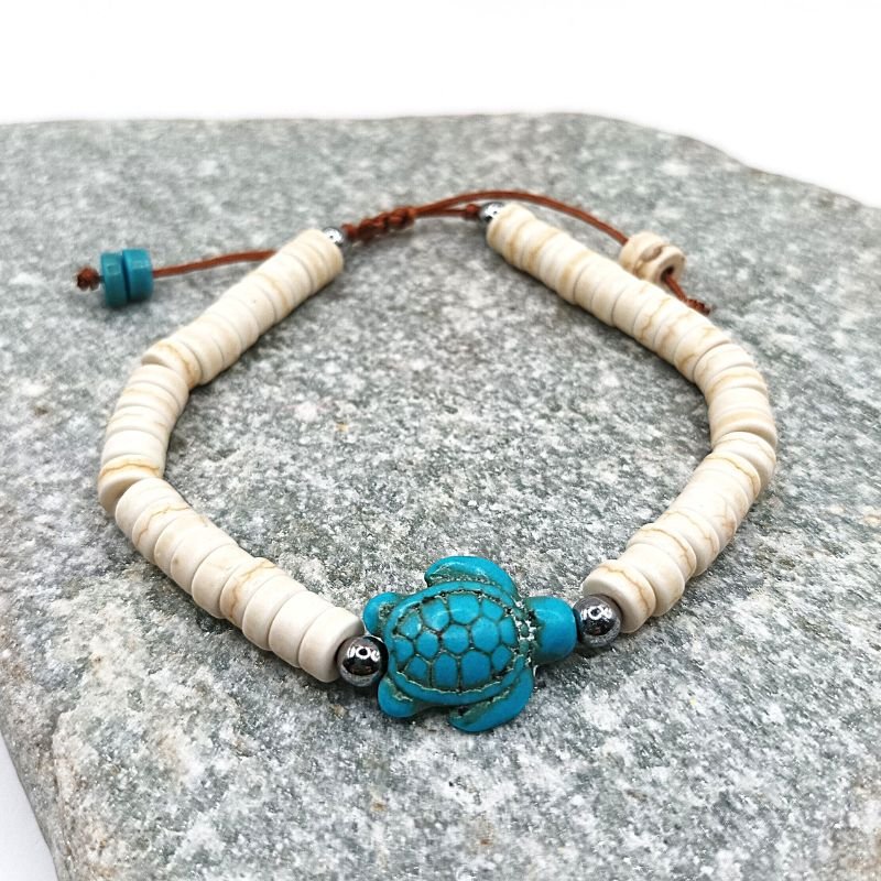 Καλοκαιρινό βραχιόλι με τυρκουάζ Χελώνα από χαολίτη και ροδέλες λευκές με εκρού λεπτομέρειες σε κορδόνι ταμπά με ρυθμιζόμενο μήκος. Μπορεί να φορεθεί στο χέρι ή στο πόδι μόνο του ή σε συνδυασμό με άλλα κοσμήματα.