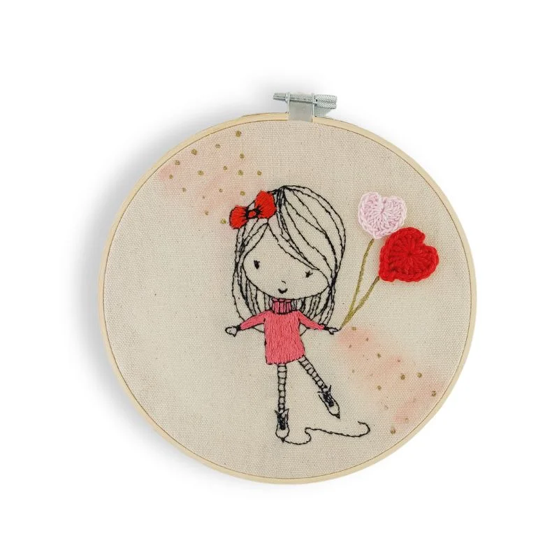 Καδράκι κεντημένο στο χέρι 19 εκατοστά με κοριτσάκι που κάνει πατιναζ και κρατά πλεκτά μπαλόνια καρδιές.