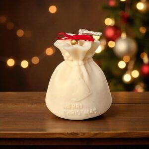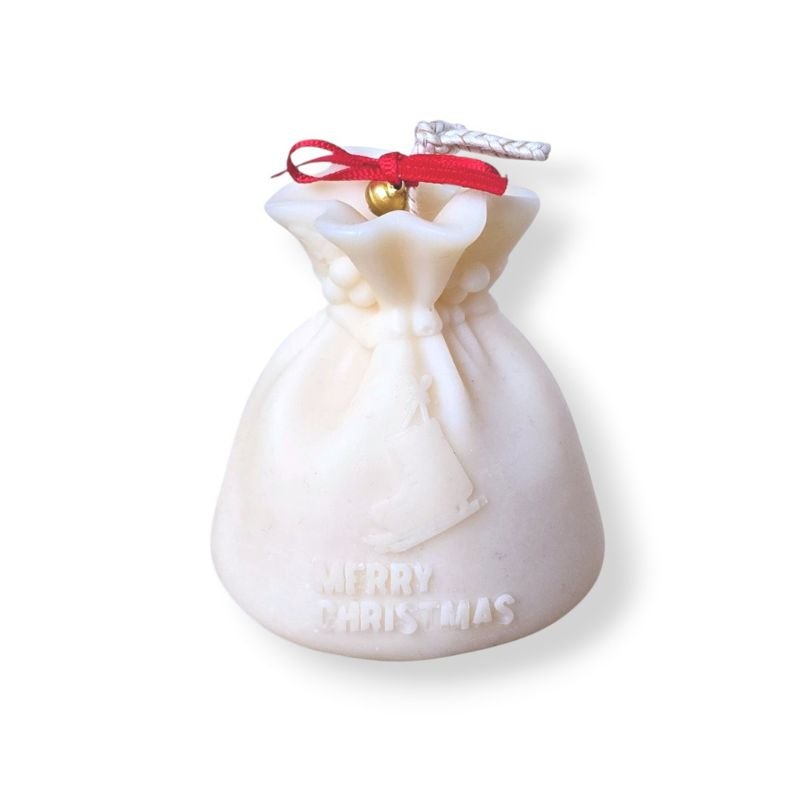 100% Φυτικό κερί ελαιοκράμβης  με βαμβακερό φυτίλι σε σχήμα Χριστουγεννιάτικος Σάκος σε χρώμα λευκό και άρωμα Πικάντικη Σταφίδα.