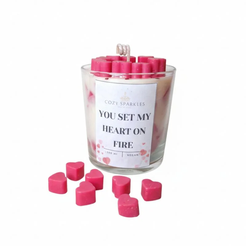 Επιλέξτε το υπέροχο κερί σόγιας για την ημέρα των ερωτευμένων διακοσμημένο με κόκκινες καρδιές από πάνω και στο εσωτερικό του κεριού. Με τικέτα αφιέρωσης”You set my heart on fire” δηλ.(ζεσταίνεις την καρδιά μου) .Δώρισέ το στον/στην αγαπημένο/η σου και κάνε του/της αυτή τη μέρα αξέχαστη. Θα το λατρέψει. Μπορείς να το αρωματίσεις όπως επιθυμείς.