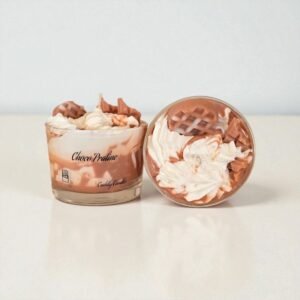 100% Φυτικό Κερί Σόγιας με βαμβακερό φυτίλι σε κομψό γυάλινο ποτήρι, εμπλουτισμένο με σαντιγί, βαφλάκι και μισή σοκολάτα για μια λαχταριστή αίσθηση για μία ξεχωριστή αίσθηση πολυτέλειας. Το άρωμα choco praline ξυπνά γλυκές και ζεστές νότες, δημιουργώντας ζεστή και ατμοσφαιρική εμπειρία στο χώρο σας.
