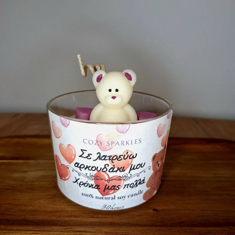 Επιλέξτε το υπέροχο κερί σόγιας με το λευκό αρκουδάκι και τις καρδιές για την ημέρα των ερωτευμένων .Διακοσμημένο με ετικέτα με αφιέρωση “Σε λατρεύω αρκουδάκι μου. Χρόνια μας πολλα”. Δώρισέ το στον/στην αγαπημένο/η σου και κάνε του/της αυτή τη μέρα αξέχαστη. Θα το λατρέψει. Μπορείς να το αρωματίσεις όπως επιθυμείς.