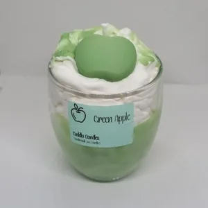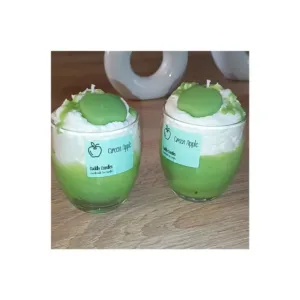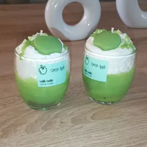 100% Φυτικό κερί σόγιας με βαμβακερό φυτίλι, σε γυάλινο ποτήρι και άρωμα Green Apple, σαντιγί και wax melt σε σχήμα μήλου.