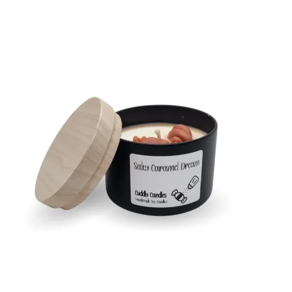 100% Φυτικό λευκό κερί σόγιας σε mini μεταλλικό μαύρο δοχείο με καπάκι και άρωμα Salty Caramel, βαμβακερό φυτίλι και wax melts σε σχήμα καραμέλας.