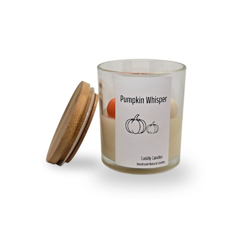 100% Φυτικό κερί σόγιας με 1 βαμβακερά φυτίλι σε γυάλινο ποτήρι με bamboo καπάκι, με 3 κολοκύθες, glitter και άρωμα Pumpkin Souffle.